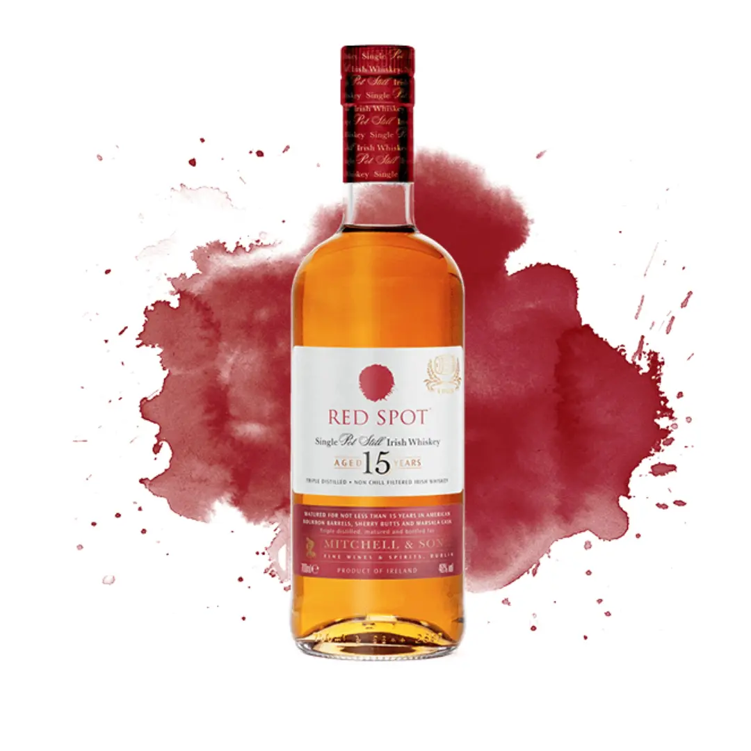 Matured for a minimum of 15 years, Red Spot is crafted using a distinctive triple-cask combination of American bourbon barrels, Spanish Oloroso sherry butts, and Sicilian Marsala wine casks. This unique maturation imparts a remarkable depth of flavour, with the Marsala casks in particular contributing layers of ripe fruit sweetness and richness that set this whiskey apart. Triple distilled from a mash of both malted and unmalted barley, it delivers the signature creamy texture and gentle spice that define the Irish pot still style.